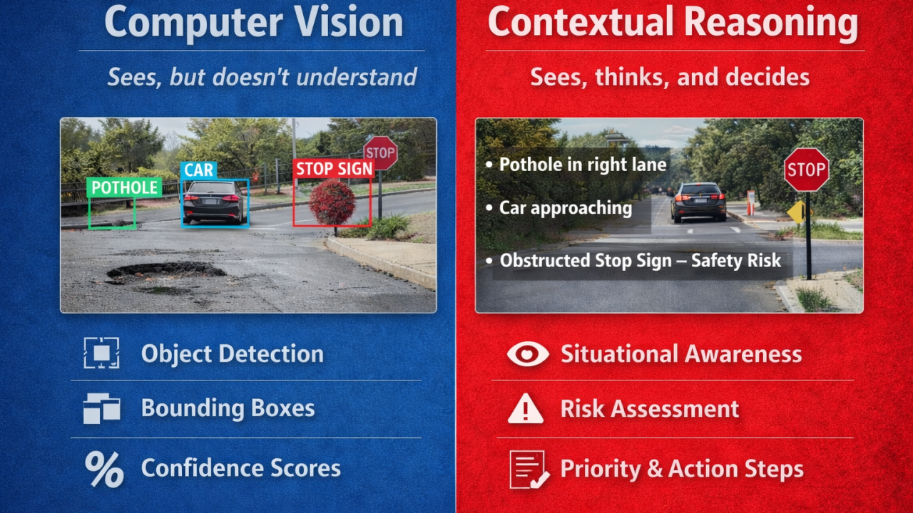 VLMs fundamentally change what computer vision systems can do. Rather than simply identifying objects, they interpret scenes. Instead of stating, “There is a stop sign,” a VLM can reason, “This stop sign is partially obscured by vegetation, reducing visibility and likely violating maintenance standards.”
